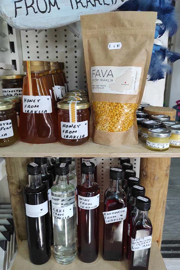 Our shop offers a variety of organic local products such as fava beans, raki, rakomelo, wine, home-made prickly pear jam (no sugar), freshly picked eggs, soft local cheese etc